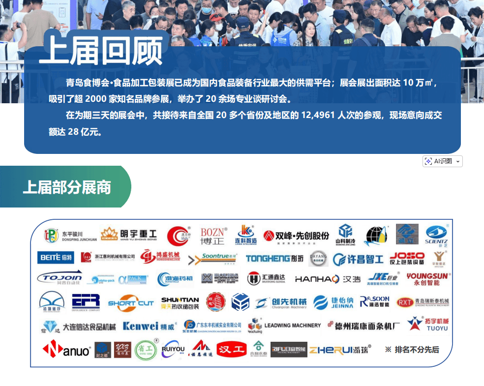 昌大举办。2026青岛食物机械展以“数智赋能食物财产,立异驱动包拆升级”为从题,汇聚全球食物加工取包拆机械范畴的最新手艺、设备及处理方案,是中国北方规模最大、影响力最强的食物机械行业嘉会。2026青岛食物机械展由食物工业协会结合从办,青岛蓝博国际会展无限公司承办,估计展出头具名积14万平方米,吸引2500+全球参展商,展出3000+项立异手艺及设备,涵盖食物加工、智能包拆、从动化出产线、冷链物流等全财产链处理方案。智能食物加工、5G使用等食物配备行业最尖端的手艺及,鞭策食物机械向从动化、数字化、智能化标的目的成长。• 智能加工设备:AI视觉检测、工业物联网(IoT)、5G智能节制手艺,实现出产全流程智能化。• 高速包拆设备:枕式包拆机产能冲破600包/分钟,自洁净模组时间缩短至15分钟,大幅提拔出产效率。效率提拔300%)、液态食物激光定位灌拆(精度±0。02毫米)。
